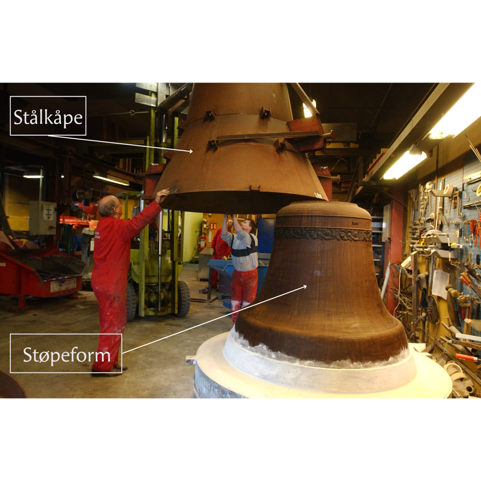 Klokkeform. Den ytre formen (kåpen) senkes ned over den indre formen (kjernen). Mellom indre og ytre form har den utsmeltede falske klokke i talg dannet et hulrom som skal fylles opp med flytende bronse og gi den ferdig støpte klokke.