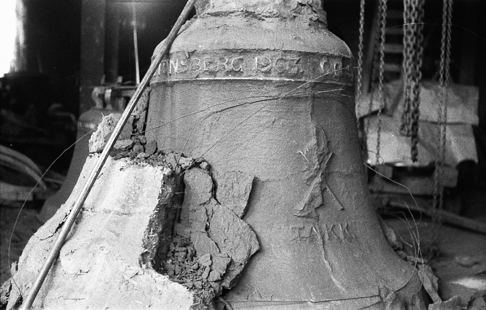 Støperiet 1964, like før vi bygget om lokalene og innførte ny formingsmetode, samt tok i bruk sementsand. Med sementsand gikk formingstiden ned fra ca. 5 til ca. 1-2 uker. Store støv- og gassplager forekom ikke lenger. Ole Chr. Olsen Nauen fjerner leirformen rundt en ferdig støpt klokke.
