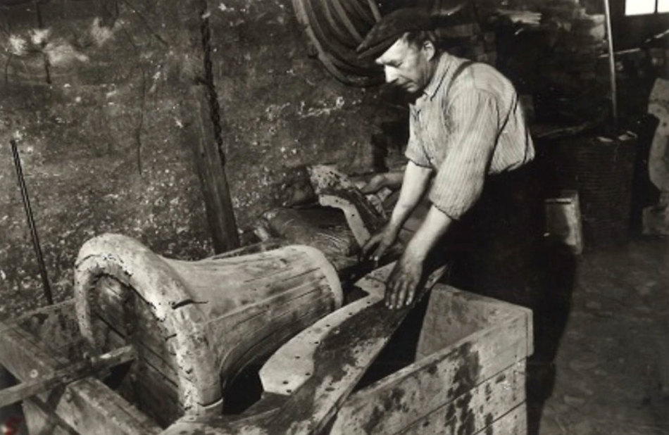 Støperiet 1964, like før vi bygget om lokalene og innførte ny formingsmetode, samt tok i bruk sementsand. Med sementsand gikk formingstiden ned fra ca. 5 til ca. 1-2 uker. Store støv- og gassplager forekom ikke lenger. Ole Chr. Olsen Nauen fjerner leirformen rundt en ferdig støpt klokke.