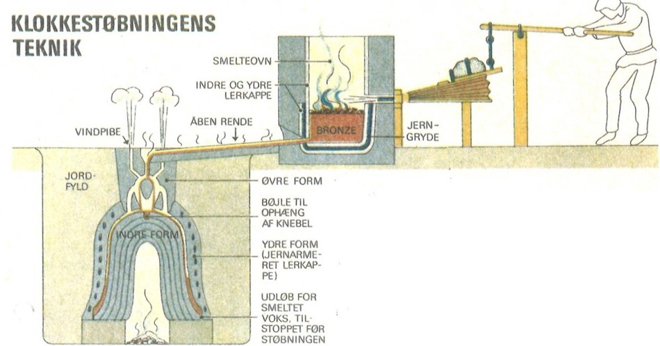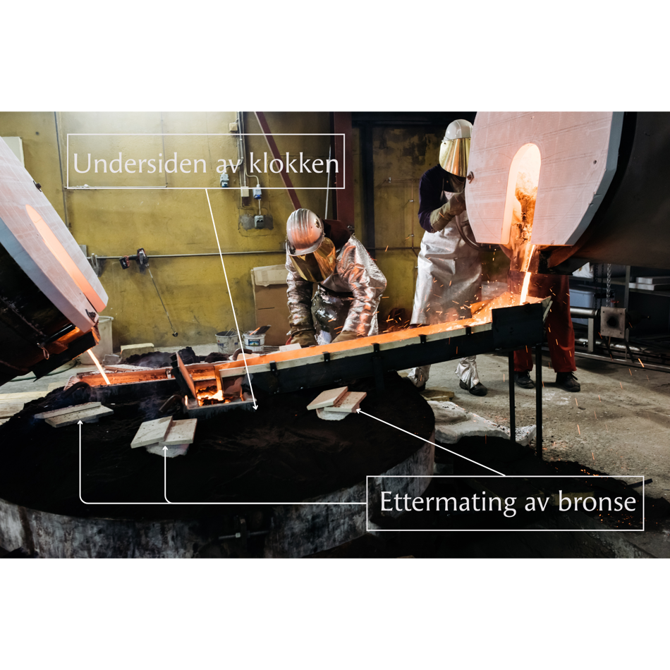 I tillegg begynte vi å støpe klokkene opp/ned, og på denne måten fikk vi en mer støpeteknisk korrekt fylling av bronsen i klokkeformen. Klokkebronsen krymper ca. 1,5% ved avkjøling og for å kompensere dette begynte vi med ettermatere som tilfører bronse til støpeformen under avkjølingsperioden.