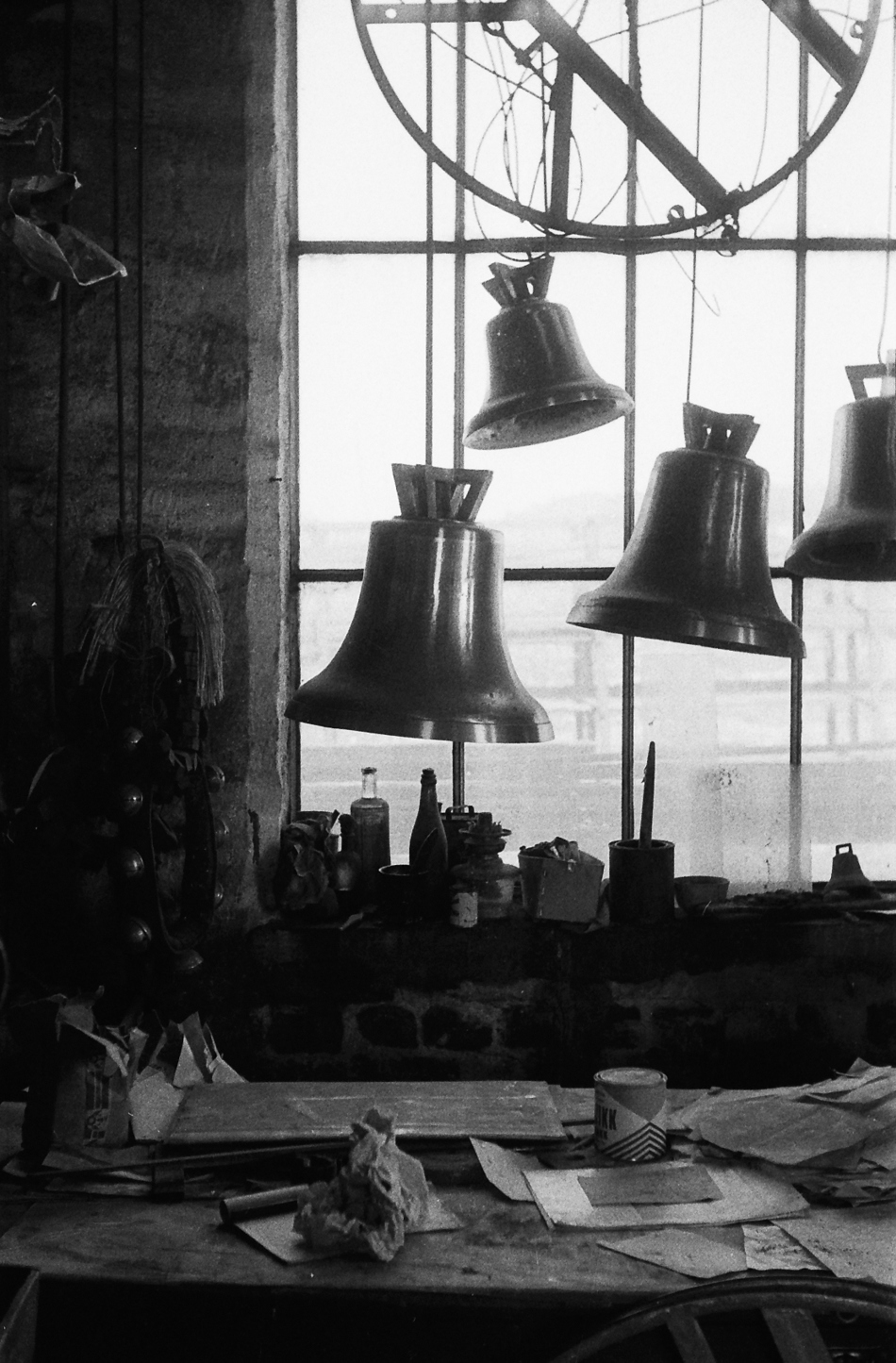Støperiet 1963 med Jørgen Borgersen. Til venstre en klokkeform under arbeid, i bakgrunnen ferdig støpeform, til høyre ferdig pusset klokke.